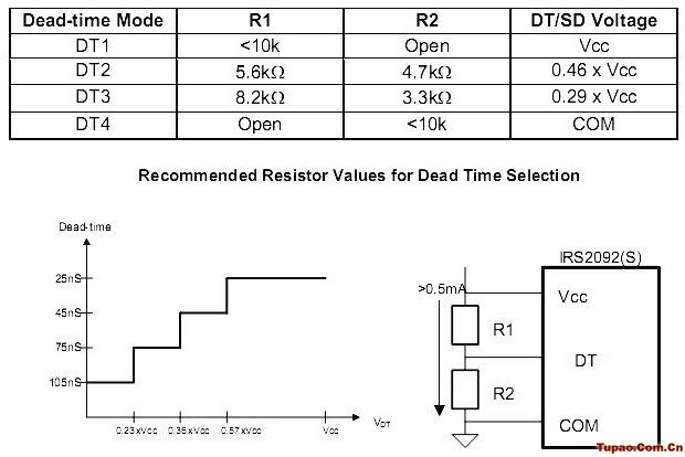 圖中:Recommended Resistor Values for Dead Time Selection(推薦選擇的死區(qū)時(shí)間電阻值)