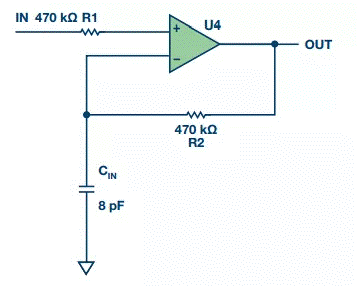 輸入電阻為470 kΩ,所以客戶在反饋路徑中放入一個(gè)470 kΩ電阻。此電阻與8 pF的輸入電容(參見圖4)一起提供一個(gè)42 kHz的極點(diǎn)。AD8628的增益帶寬積為2 MHz,因此它在42 kHz仍有大量增益,并發(fā)生了軌到軌振蕩。把470 kΩ電阻換成0 Ω跳線即解決了問(wèn)題。因此,反饋路徑中應(yīng)避免使用大電阻。這里,何者為大取決于運(yùn)算放大器的增益帶寬。對(duì)于高頻運(yùn)算放大器,例如增益帶寬積超過(guò)400 MHz的ADA4817-1,1 kΩ反饋電阻就稱得上是大電阻。務(wù)必閱讀數(shù)據(jù)手冊(cè)以了解其中的建議。
