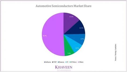 但是,我們認(rèn)為,由于其歐洲本土競爭對(duì)手(憑借領(lǐng)先的高端汽車制造商品牌的強(qiáng)大網(wǎng)絡(luò)作為合作伙伴)在本國市場的優(yōu)勢,因此后者在這一細(xì)分市場中的地位更高。英飛凌,恩智浦等歐洲供應(yīng)商的市場領(lǐng)先地位證明了這一點(diǎn)。數(shù)據(jù)顯示,意法半導(dǎo)體占該市場份額的32.8%,而德州儀器(TI)則為8.1%。