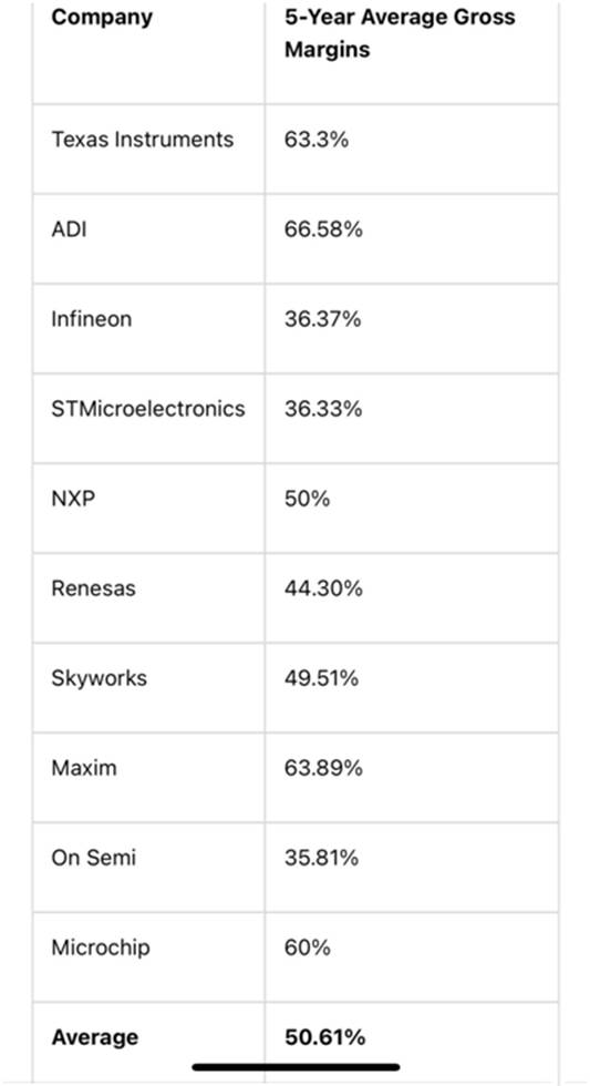 此外,該公司對(duì)內(nèi)部制造的關(guān)注以及對(duì)300mm晶圓的關(guān)注都是引致他們獲得高毛利率的原因。在其競爭對(duì)手中,德州儀器(TI)的5年平均毛利潤率僅次于Analog Devices和Maxim,位居第三,但遠(yuǎn)高于行業(yè)平均水平50.61%。