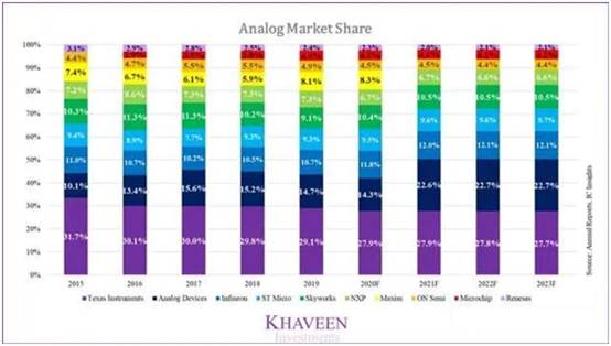 到2020年,德州儀器(TI)仍然是508億美元模擬市場的市場領(lǐng)導(dǎo)者,根據(jù)其當(dāng)年的收入增長估計(jì),在前十大模擬廠商中的市場份額估計(jì)為27.9%。但是,這比2019年的29.1%的市場份額下降了1.2%,并且由于市場競爭加劇,市場份額長期呈下降趨勢。