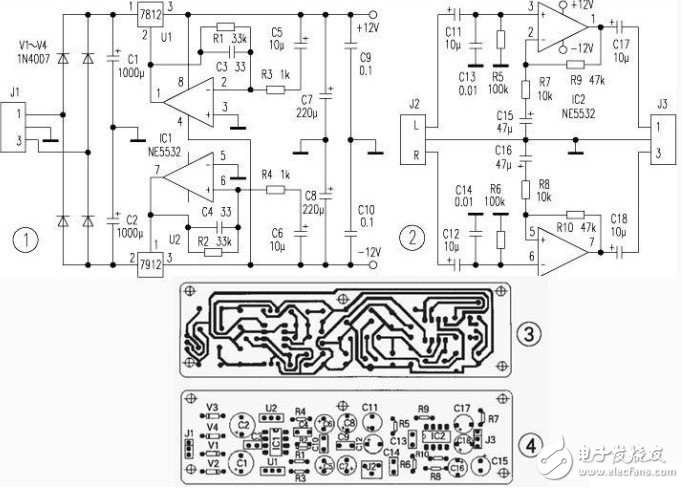 圖1為前放電路的直流伺服電源電路,給前放電路提供穩(wěn)定的±12V電源。穩(wěn)壓電路采用三端集成穩(wěn)壓塊,并且使用一片NE5532構(gòu)成伺服電路,實現(xiàn)對輸出電壓的實時跟蹤與調(diào)整。圖2為前置放大電路,電路采用了“運放之星”NE5532構(gòu)成同相比例運算放大電路,其放大倍數(shù)為5倍左右(主要由R9、R7、R10、R8決定),C15、C16在電路中具有提升高音頻信號的作用。J1接環(huán)變的雙12V輸出端,J2為信號輸入端,J3為信號輸出端(接功放輸入端)。