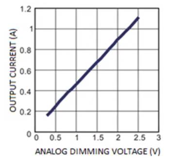 作為示例,本文采用了MPQ2489-AEC1,這是一種60V,1 A汽車級(jí)降壓LED驅(qū)動(dòng)器,如圖1所示。該驅(qū)動(dòng)器同時(shí)實(shí)現(xiàn)了PWM和模擬調(diào)光,盡管在本應(yīng)用中僅使用后者。要使用模擬調(diào)光功能,必須在DIM引腳上施加0.3至2.5V的DC電壓。該電壓可以在250 mA和1.1 A之間線性調(diào)節(jié)LED電流(圖2)。當(dāng)直流電壓介于0.3至1.25V之間時(shí),會(huì)產(chǎn)生250至550 mA之間的電流。