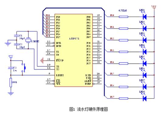 當(dāng)今時(shí)代是一個(gè)新技術(shù)層出不窮的時(shí)代,在電子領(lǐng)域尤其是自動(dòng)化智能控制領(lǐng)域,傳統(tǒng)的分立元件或數(shù)字邏輯電路構(gòu)成的控制系統(tǒng),正以前所未見的速度被單片機(jī)智能控制系統(tǒng)所取代。單片機(jī)具有體積小、功能強(qiáng)、成本低、應(yīng)用面廣等優(yōu)點(diǎn),可以說,智能控制與自動(dòng)控制的核心就是單片機(jī)。目前,一個(gè)學(xué)習(xí)與應(yīng)用單片機(jī)的高潮正在工廠、學(xué)校及企事業(yè)單位大規(guī)模地興起。學(xué)習(xí)單片機(jī)的最有效方法就是理論與實(shí)踐并重,本文筆者用AT89C51單片機(jī)自制了一款簡(jiǎn)易的流水燈,重點(diǎn)介紹了其軟件編程方法,以期給單片機(jī)初學(xué)者以啟發(fā),更快地成為單片機(jī)領(lǐng)域的優(yōu)秀人才。