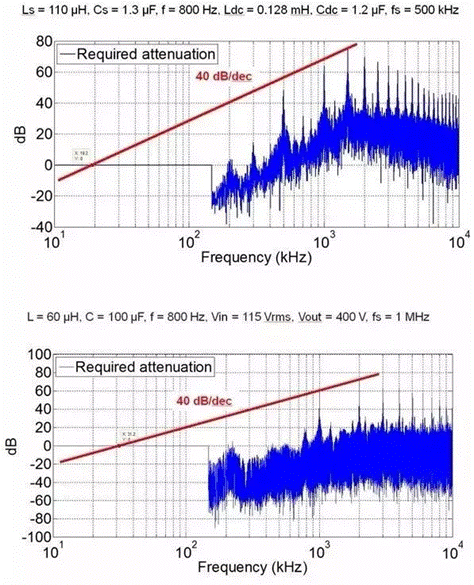 為了說(shuō)明這個(gè)結(jié)論,我給出一些定量分析結(jié)果。這些EMI分析均基于AC/DC三相整流,拓?fù)錇榫S也納整流。我分別給出了1Mhz和500Khz的共模噪聲,可以看出,500khz共模濾波器需要的截止頻率為19.2kHz,1MHz為31.2kHz。