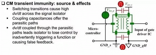 同時(shí),選隔離芯片的時(shí)候也需要注意一個(gè)參數(shù)叫做CM transient immunity(肯定會(huì)給的),這個(gè)參數(shù)最好大于開關(guān)瞬間,橋臂中點(diǎn)電平的變化速率。光耦隔離這個(gè)參數(shù)一般在30kV/us,磁耦在35kV/us,電容耦合在50kV/us(是不是絕望了,都比氮化鎵低,硅器件一般在10kV/us,Sic 30kV/us)。