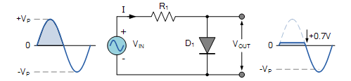 如下圖所示,當(dāng)在正半周期,并且VIN大于等于0.7V,二極管正向?qū)ā4藭r(shí),VOUT會(huì)被鉗位在0.7V上。
