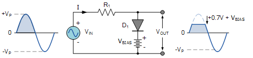 當(dāng)所加的偏壓與二極管導(dǎo)通方向一致,鉗位值會(huì)提高V1,Vout=2V+V1。