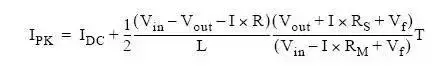其中,Rs為感應(yīng)電阻阻抗加電感繞線電阻的阻。Vf 是肖特基二極管的正向壓降。R是Rs加MOSFET導(dǎo)通電阻,R=Rs+Rm。