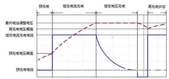 典型的充電方式是:先檢測待充電電池的電壓,在電池電壓較低情況下,先進行預(yù)充電,充電電流為設(shè)定的最大充電電流的1/10,當(dāng)電池電壓升到一定值后,進入標(biāo)準(zhǔn)充電過程。標(biāo)準(zhǔn)充電過程為:以最大充電電流進行恒流充電,電池電壓持續(xù)穩(wěn)定上升,當(dāng)電池電壓升到接近設(shè)定的最大電壓時,改為恒壓充電,此時,充電電流逐漸下降,當(dāng)電流下降至最大充電電流的1/10時,充電結(jié)束。