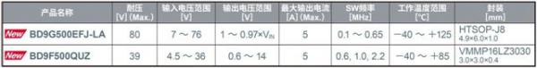 “BD9G500EFJ-LA”適用于48V電源系統(tǒng),具有業(yè)內(nèi)超高的80V耐壓,同時由于其內(nèi)置MOSFET,可實現(xiàn)同類產(chǎn)品中高達(dá)5A的輸出電流,且支持大功率,從而有助于5G通信基站和充電樁等設(shè)備實現(xiàn)更高可靠性和性能。而“BD9F500QUZ”則適用于24V電源系統(tǒng),采用小型薄型封裝(3.0mm×3.0mm×0.4mm),雖然小巧卻實現(xiàn)了39V的耐壓和5A的輸出電流,有助于以FA設(shè)備為首的眾多先進(jìn)工業(yè)設(shè)備實現(xiàn)更高性能和更小體積。