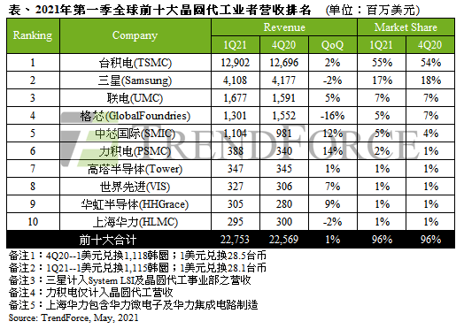 2021第一季全球前十大晶圓代工者營(yíng)收排名出爐