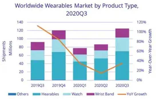 根據(jù)IDC最新數(shù)據(jù),全球可穿戴設(shè)備市場在2020年第三季度同比增長35.1%,總出貨量達(dá)到1.25億臺。這種激增在很大程度上是由兩大因素推動的,一方面,蘋果(Apple)、三星(Samsung)等公司的新產(chǎn)品讓人們重燃對智能手表和耳機(jī)等熱門產(chǎn)品的購買熱情。另一方面,受疫情影響,人們外出旅行、就餐和其他休閑活動大幅減少,在電子產(chǎn)品上的支出在最近幾個月有了一定增加,尤其是與健康監(jiān)測密切相關(guān)的可穿戴電子產(chǎn)品。