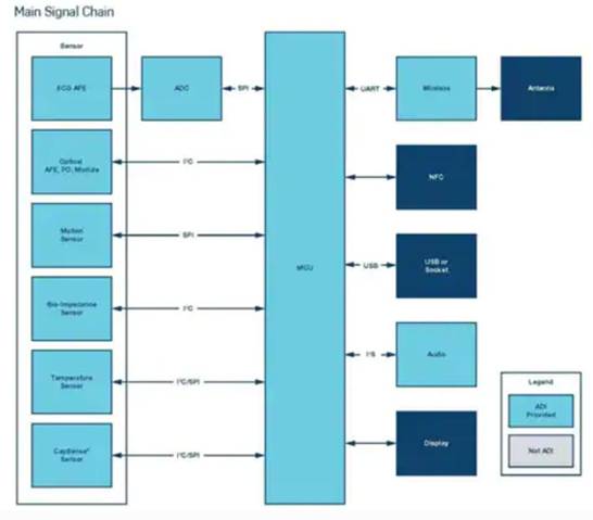 在可穿戴技術(shù)上,ADI提供的是一攬子解決方案,也可以說是完整的系統(tǒng)級解決方案。方案的最大特點(diǎn)是低功耗、診斷級性能、高集成/小體積。涉及傳感器、模擬信號處理、數(shù)字信號處理、無線通信等多種芯片,開發(fā)工具、算法等也包含在內(nèi)。