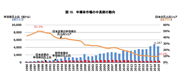 增長戰(zhàn)略草案首先提到,日本半導(dǎo)體產(chǎn)業(yè)較之前有所衰落。日本增長戰(zhàn)略委員會在草案中寫道,1988 年,日本在全球半導(dǎo)體市場的銷售份額為 50% 左右;2019 年,這一比例已經(jīng)降到了 10%。