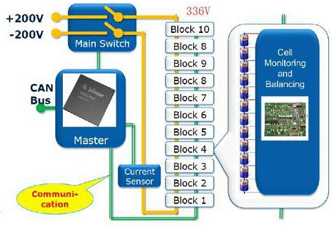 鋰電池儲(chǔ)能能力強(qiáng),但單個(gè)電池的電壓和電流都太低,不足以滿足混合動(dòng)力電機(jī)的需要。為增加電流需將多個(gè)電池并聯(lián)起來,為獲得更高的電壓,則要把多個(gè)電池串聯(lián)起來。單個(gè)鋰電池的電壓一般介于3.3~3.6V之間。例如,將多達(dá)12 個(gè)電池串聯(lián)組成一個(gè)電池塊(block)輸出電壓介于30~45V 之間,而混合動(dòng)力汽車驅(qū)動(dòng)需要336V左右的直流電源電壓,因此通常需要8-10個(gè)電池塊(block)串聯(lián)起來使用,意味著電動(dòng)汽車的電池組是數(shù)量眾多的的單體電池組成(100節(jié)以上)。