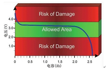 電池一旦電壓超出允許范圍,鋰電池很容易被損壞(見圖1.1.3)。如果超出電壓的上限和下限(例如,nanophosphate鋰電池的電壓上限和下限分別為3.6V和2V),電池就可能會(huì)受到不可逆的損壞,至少也會(huì)增加電池的自放電率。在相當(dāng)寬的荷電狀態(tài)范圍內(nèi),輸出電壓可以保持穩(wěn)定,因此正常情況下超出安全范圍的可能性比較小。但是,在接近安全范圍上限和下限的區(qū)域,變化曲線非常陡峭。作為預(yù)防措施,仔細(xì)監(jiān)測(cè)電壓水平非常必要。