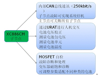 控制上述MOSFET工作的是汽車級(jí)8位單片機(jī)XC886CM,該單片機(jī)具有8通道10位AD,可以方便的采集各個(gè)電池單元的電壓數(shù)據(jù)和溫度數(shù)據(jù)。QFP-48的封裝使它有足夠的IO完成多達(dá)13個(gè)MOSFET的控制工作。CAN、SPI、UART等豐富的通信接口使子節(jié)點(diǎn)具有CAN總線通信功能之外,能夠?qū)崿F(xiàn)和PC的通信,以方便試驗(yàn)階段的控制和演示。硬件乘除單元MDU可進(jìn)行16位數(shù)據(jù)的乘除,實(shí)現(xiàn)快速運(yùn)算。
