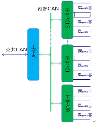 電池管理系統(tǒng)采用獨(dú)立的內(nèi)部CAN總線進(jìn)行數(shù)據(jù)和指令傳輸,每個(gè)內(nèi)部CAN總線子節(jié)點(diǎn)電路和最大12節(jié)串聯(lián)電池單元相連,組成電池包。各個(gè)電池包串聯(lián)組成電動(dòng)汽車所需的電池總成。主節(jié)點(diǎn)采用汽車級(jí)16位單片機(jī)XC2267連接內(nèi)部CAN網(wǎng)絡(luò),同時(shí)接入電動(dòng)汽車上的公共CAN網(wǎng)絡(luò),收發(fā)相關(guān)的指令和數(shù)據(jù)。見圖3.1.1