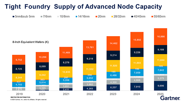 盛陵海認(rèn)為,半導(dǎo)體“供需緊張”的狀況將會延續(xù)到明年第二季度。根據(jù)Gartner最新的預(yù)測中顯示,5納米及以下工藝產(chǎn)能增幅最大,5納米產(chǎn)能的增加,將會推動先進(jìn)制成市場的成長。此外,55納米雖然制成較老,但目前需求量非常大,5納米/65納米工藝會有很大的增長空間;而28納米、14納米、16納米市場前景也非常樂觀。