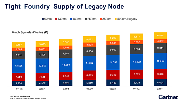 傳統(tǒng)制成大多數(shù)集中在8英寸晶圓,如今8英寸晶圓非常緊缺,源于早期8英寸建設(shè)高峰時期,過多的產(chǎn)能導(dǎo)致市場出現(xiàn)過剩,市場上長期低價競爭,加之很多企業(yè)陸續(xù)關(guān)閉了8英寸晶圓工廠,而設(shè)備廠商陸續(xù)全線轉(zhuǎn)向12英寸,晶圓廠無法提高8英寸產(chǎn)能。此外,5G手機(jī)對PMIC、模擬電路需求量激增,大部分為8英寸晶圓,如此以來,需求與產(chǎn)能的供需不平衡,導(dǎo)致8英寸制成緊缺的局面。盛陵海指出,目前8英寸產(chǎn)線沒有新廠的投資,大多數(shù)均為擴(kuò)產(chǎn),實(shí)際是為了滿足增加的迫切需求,但要徹底解決8寸制成緊缺的問題,仍需要將8寸的產(chǎn)能轉(zhuǎn)向12寸。