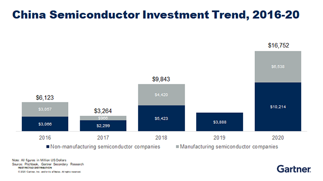 根據(jù)Gartner公開的資料顯示,中國半導(dǎo)體企業(yè)以及相關(guān)企業(yè)獲得投資規(guī)模主要來源于非生產(chǎn)型的半導(dǎo)體公司和生產(chǎn)型的半導(dǎo)體公司。近兩年間,“非生產(chǎn)型的半導(dǎo)體公司”融資已有非常大的提升,如GPU公司。此外,自動駕駛和“寬禁帶半導(dǎo)體”的投資規(guī)模也逐步增加,像華為、小米以及英特爾、高通、三星等海外企業(yè)在中國國內(nèi)積極投資。對于生產(chǎn)型企業(yè),規(guī)模和數(shù)量都有所增加。此外,科創(chuàng)板的出現(xiàn)帶動了整個投資熱潮,讓很多的投資逐漸集中于半導(dǎo)體產(chǎn)業(yè),如高瓴資本、紅杉資本等開始涉足半導(dǎo)體企業(yè),幫助了新興公司能盡快地進(jìn)行產(chǎn)品創(chuàng)新或是利用最先進(jìn)制成打造產(chǎn)品。