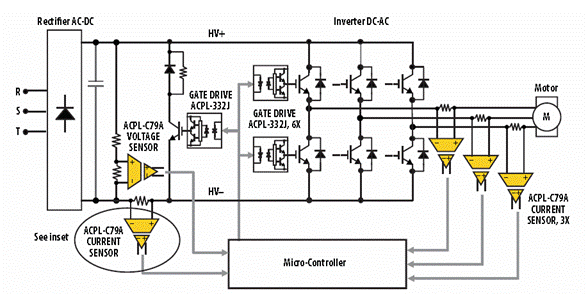 隔離放大器 (iso-amp),例如圖 1b 中所示的 ACPL-C79A1,與分流電阻器配合使用,即使在存在高開關(guān)噪聲的情況下,也能在電源轉(zhuǎn)換器中提供準(zhǔn)確的電流測量。當(dāng)與電阻分壓器一起使用時,iso-amp 用作精密電壓傳感器來監(jiān)控直流總線電壓。來自iso-amps的電流和電壓信息由微控制器收集,微控制器使用數(shù)據(jù)計算反饋值和輸出信號,以在電源轉(zhuǎn)換器中提供有效的控制和故障管理。