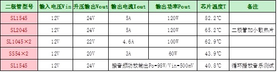(5). HT7179接不同型號二極管對應(yīng)升壓輸出電壓、電流、功率以及芯片表面溫度測試: