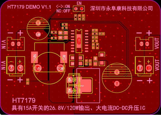 深圳市永阜康科技有限公司針對大功率的DC-DC升壓應(yīng)用需求,推廣一款集成15A開關(guān)管的26.8V、120W輸出、大電流非同步DC-DC升壓IC-HT7179。HT7179采用獨(dú)到的電路研發(fā)技術(shù)以及先進(jìn)的半導(dǎo)體工藝,重載時(shí)高達(dá)93%以上的工作效率,無需外加散熱器,升壓到26.8V,可穩(wěn)定輸出120W。