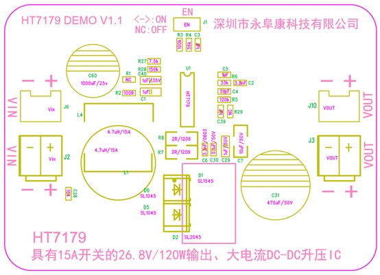 HT7179輸入電壓最低到2.7V,升壓輸出最高到26.8V。開關(guān)頻率固定350kHz,峰值電流可通過外圍電阻編程最大15A。支持低EMI工作模式,方便靈活。采用eSOP-16封裝,加上完善的輸出過壓,過熱保護(hù),指標(biāo)以及可靠性非常出色。HT7179是替代26V/100W左右