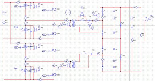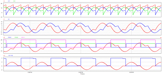 上述 圖中可以看出前級開關(guān)管均實(shí)現(xiàn)了ZVS,副邊實(shí)現(xiàn)了ZCS(圖4中情況除外),半橋相位關(guān)系如圖5所示。