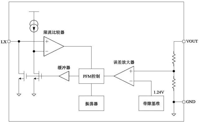 PL2303的內(nèi)部結(jié)構(gòu) 電感的選擇: PL2303的工作頻率高達(dá) 300KHz,目的是為了能夠減小外部電感尺寸, 只需要 4.7uH 以上的電感就可以保證正常工作, 但是輸出端如果需要輸出大電流負(fù)載(例如:輸出電流大于 50mA),為了提高工作效率,建議使用較大電感。綜合考慮,建議使用47uH、 寄生串聯(lián)電阻小于 0.5Ω 的電感。如果需要提高大負(fù)載時(shí)的效率, 則需要使用更大電感值、更小寄生電阻值的電感。 用于整流的二極管對(duì)DC- DC 的效率影響很大,雖然普通的二極管也能使電路工作正常,但是會(huì)降低 5~10%的效率,所以建議使用正向?qū)妷旱、反?yīng)時(shí)間快的肖特基二極管,如 1N5817、1N5819、 1N5822 等。 只要電源穩(wěn)定,即使沒有輸入濾波電容,電路也可以輸出低紋波、低噪聲的電流電壓。但是當(dāng)電源距離 DC-DC電路較遠(yuǎn),建議在 DC-DC 的輸入端就近加上 10uF 以上的濾波電容,用于減小輸出噪聲。