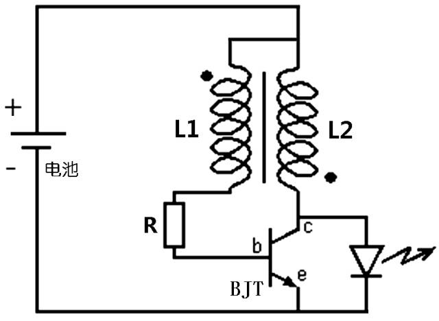 標(biāo)準(zhǔn)焦耳神偷電路 通常1.5V的干電池用完之后還會(huì)有1.1V左右的電壓,說明此時(shí)電池內(nèi)還有能量,只不過內(nèi)阻已經(jīng)變的很大,輸出電流很微弱,已經(jīng)無(wú)法驅(qū)動(dòng)一般的電路,更無(wú)法點(diǎn)亮LED。而焦耳神偷電路可以通過磁感線圈產(chǎn)生高頻脈沖電壓,使LED導(dǎo)通,通過調(diào)整合適的參數(shù),可以將電池電壓升高10-100倍以上。 焦耳神偷原理 1. 電流經(jīng)L1流入BJT的基極,使BJT開始導(dǎo)通,集電極產(chǎn)生電流,集電極端的線圈L2產(chǎn)生變化磁通量,使基極線圈L1感應(yīng)出電動(dòng)勢(shì),并正向加在BJT的基極上。 2. 基極電流由于加了電動(dòng)勢(shì)而增大,使BJT集電極電流進(jìn)一步增加,這個(gè)正反饋將持續(xù),直到BJT飽和,基極電流的變化無(wú)法再引起集電極電流的變化。