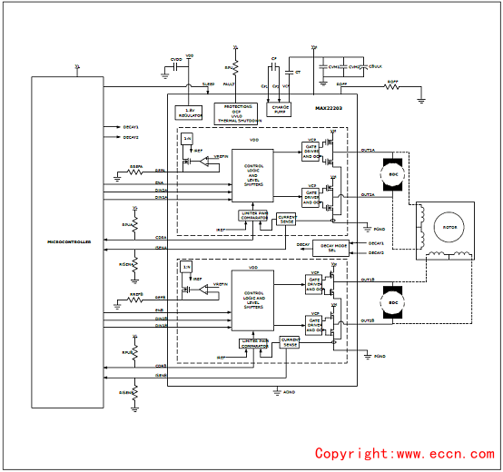 The integrated CDR can limit the start up or stall the currentof a Brushed DC motor or control the phase currentfor stepper operation.