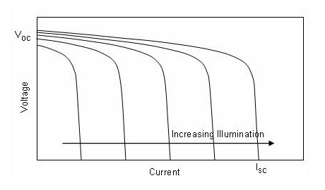 并行電阻 (RP) 表示實(shí)際電池發(fā)生的較小漏電流,而 Rs 則表示連接損耗。隨著負(fù)載電流的增加,太陽(yáng)能電池生成的電流會(huì)有更多一部分偏離二極管而進(jìn)入負(fù)載。對(duì)大多數(shù)負(fù)載電流值來(lái)說(shuō),這對(duì)輸出電壓僅產(chǎn)生很小的影響。