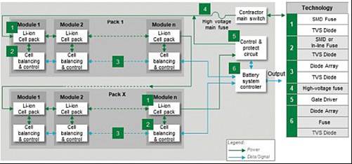 我們已經(jīng)討論了具有高額定電壓的主保險絲模塊的輸出。每個單獨的電池包也應該融合。低壓熔斷器可用于此目的。每個模塊都有自己的微處理器來監(jiān)控電池狀態(tài)并將其報告給主控制器。因此,有線接口應使用 TVS 二極管陣列來保護 CAN 總線。