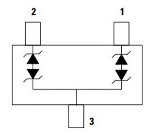 雙向保護 ESD 二極管的示例示意圖,由兩個陽極到陽極連接的 TVS 二極管組成。 (參考:AQxxC-01FTG TVS 二極管陣列)