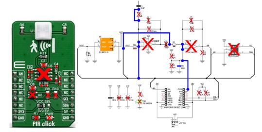因此,使用此類(lèi)MCU,可顯著減少PIR click的PCB布線工作。圖2展示了可以省去的元件(X)以及新的連接方式(藍(lán)色線條)。