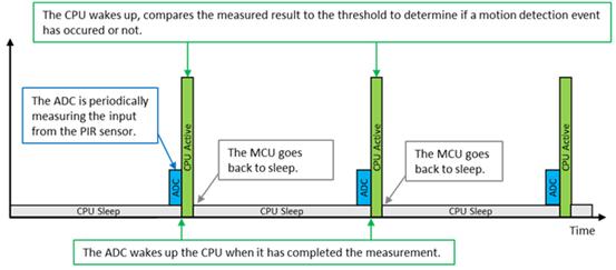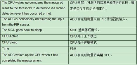 由于MCU具有休眠模式并且可快速喚醒,每個(gè)傳感器節(jié)點(diǎn)的功耗都可以達(dá)到非常低的水平。節(jié)點(diǎn)可以休眠,當(dāng)在傳感器檢測(cè)范圍內(nèi)出現(xiàn)溫度變化并由此檢測(cè)到運(yùn)動(dòng)時(shí),節(jié)點(diǎn)就會(huì)快速喚醒,并在完成信號(hào)處理后返回休眠模式。因此,能夠延長(zhǎng)每個(gè)電池供電節(jié)點(diǎn)的工作時(shí)間,而無(wú)需更換電池。請(qǐng)參見(jiàn)圖4,了解使用休眠模式和快速喚醒時(shí)CPU的運(yùn)行方式。功耗取決于具體應(yīng)用,并且會(huì)根據(jù)PIR傳感器的配置、采樣時(shí)間和濾波參數(shù)而有所不同,這些因素也會(huì)影響傳感器的檢測(cè)范圍和/或靈敏度。若應(yīng)用需要達(dá)到更低的功耗,可以對(duì)這些參數(shù)進(jìn)行調(diào)整,進(jìn)一步降低功耗。