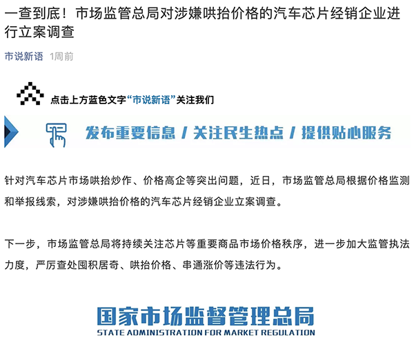 針對汽車芯片市場哄抬炒作、價格高企等問題,8 月 3 日,國家市場監(jiān)管總局官方公眾號發(fā)文稱,市場監(jiān)管總局近日根據(jù)價格監(jiān)測和舉報線索,對涉嫌哄抬價格的汽車芯片經(jīng)銷企業(yè)立案調(diào)查。