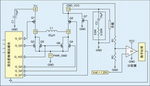 周期2:Q2及Q3開通,且存儲在電感L1中的能量通過Q2轉(zhuǎn)移到外接負(fù)載。在此階段,Q1/Q4及Q5/Q6關(guān)斷。電流流通周期是900ns恒定值(典型值),如果CRD_VCC電壓低于規(guī)定值,在這段時(shí)間以后重復(fù)周期1。