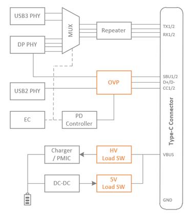 相比早期版本的其他 USB 接口,Type-C 的 VBUS 引腳更容易由于異物或異常插拔與相鄰引腳發(fā)生短路。由于 VBUS 的電壓典型可能高達(dá) 20V ,與低壓引腳之間(如CC、SBU、Tx/Rx 等)發(fā)生短接會(huì)造成嚴(yán)重后果。其次,Type-C 應(yīng)用的電源路徑需要具有大電流通流能力,對(duì)潛在的負(fù)載短路、過電流等危險(xiǎn)做出有效防護(hù)。此外,作為電子設(shè)備的外接接口,ESD 和浪涌的侵害必須從系統(tǒng)層面加以重視,熱插拔等原因造成的過電壓也必須加以考慮。