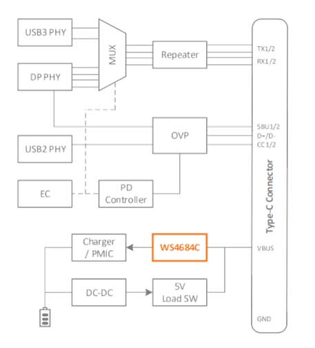 WS4684C-15/TR、WS4683C-16/TR 和 WS3233Q-20/TR 的組合實(shí)現(xiàn)了對(duì)過壓、過流、過溫、浪涌、ESD 等各種常見干擾異常的保護(hù)和抑制,是業(yè)界完善的 USB Type-C 接口保護(hù)方案之一。
