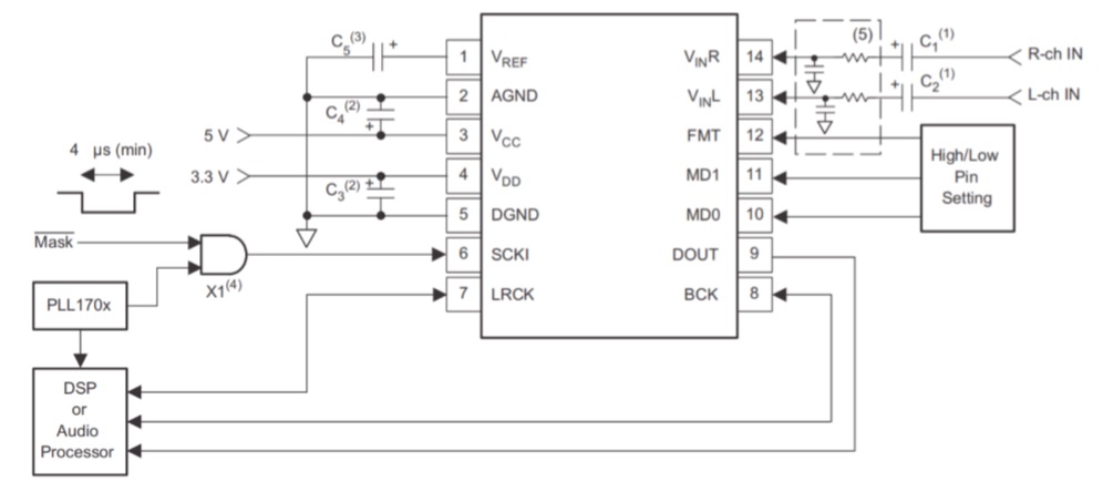 ADC輸入是單端而且內(nèi)部通過20kΩ電阻偏置在共模電壓(50%*VCC)(典型@fs=48kHz)。輸入信號(hào)范圍隨著電源電壓擴(kuò)張,正常情況為 0.6*VCC Vpp(典型)。ADC 輸出數(shù)據(jù)格式是二進(jìn)制的補(bǔ)碼。內(nèi)部高通濾波器消除直流失調(diào)電壓。