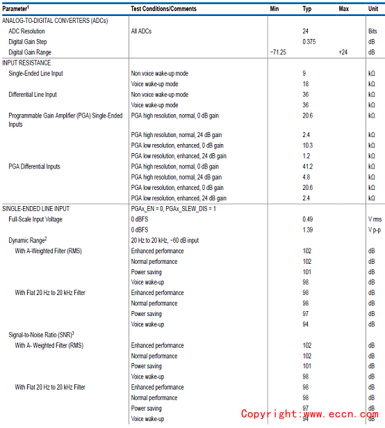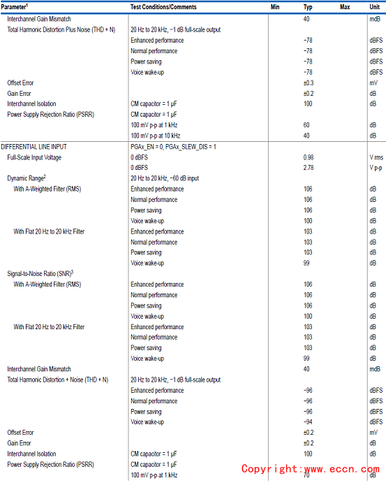 ADI公司的ADAU1850是具有三個輸入和一個輸出的集成了數字信號處理器的編譯碼器(CODEC).從模擬輸入到DSP核到模擬輸出的通路經過優(yōu)化,具有低等待時間,非常適合于降噪音耳機使用.只需要增加少許無源元件, ADAU1850提供了完整的耳機解決方案. ADAU1850具有可編程的FastDSP音頻處理引擎,高達768kHz取樣速率,具有Biquad濾波器,限幅器,音量控制和混合等功能,低等待時間的24位ADC和DAC,106dB SNR(信號通過ADC和A加權濾波器),串口取樣速率從8kHz到768kHz,模擬到模擬群時延為5 μs,可編程雙精度MAC引擎用于13級均衡器,3個模擬輸入(2個差分和一個單端),可配置成麥克風或線輸入.模擬差分風音頻輸出,可配置成線路輸出或耳機驅動器,PLL支持30 kHz到27 MHz的任何輸入時鐘,1路ASRCI,三路ASRCO,串行音頻端口支持I2S,左對齊,或高達16路TDM (TDM16),具有靈活路經的兩個插值器和4個抽取器.模擬AVDD電源電壓為1.8V.數字I/O IOVDD電壓為1.8V到3.3V.通信接口為I2C,SPI和UART.采用28點0.4mm間隔2.957 mm × 1.757 mm WLCSP封裝.主要用在降噪手機和耳機,藍牙有源降噪(ANC)手機和耳機,PND,數字照相機和攝影機,樂器效果處理器,多媒體揚聲器系統(tǒng)和智能手機.本文介紹了ADAU1850主要特性,功能框圖和模擬性能指標,以及評估板EVALADAU1850EBZ主要特性,框圖,電路圖和材料清單.
