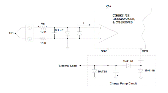 CS5521 / 23,CS5522 / 24/28和CS5525 / 26系列A / D轉(zhuǎn)換器包括一個斬波穩(wěn)定儀表放大器,用于測量低電平直流信號(±100 mV或更。T摲糯笃髟O(shè)計為產(chǎn)生非常低的輸入采樣電流(-40至+85 + C時ICVF <300 pA)。如圖1所示,當(dāng)使用高阻抗電路進(jìn)行輸入保護(hù)時,低輸入電流可將熱電偶測量中可能發(fā)生的誤差減至最小。