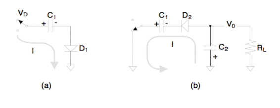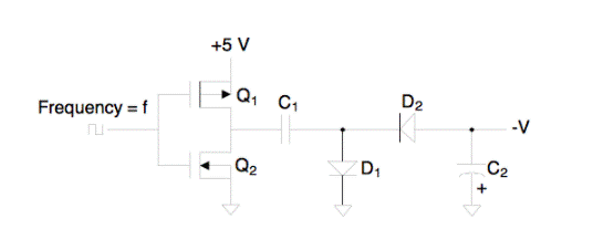 圖2說明了基本的二極管電荷泵。晶體管Q1和Q2代表CMOS反相器的輸出晶體管。當(dāng)反相器的輸入導(dǎo)致晶體管Q1導(dǎo)通(Q2截止)時,C1通過二極管D1充電至大約5 V的電壓減去二極管的正向電壓。當(dāng)逆變器的輸出切換為Q1斷開,Q2接通時,C1帶正電的導(dǎo)線將接地。由于電容器兩端的電壓不能瞬時改變,因此連接到二極管D2的C1的引線將變?yōu)樨?fù),從而導(dǎo)通二極管D2。C1上的電荷然后將流到C2上并產(chǎn)生負(fù)輸出電壓。電容器C2充當(dāng)電荷的儲存器,并且比電荷泵電容器C1大得多。在經(jīng)過數(shù)個電荷泵循環(huán)后,