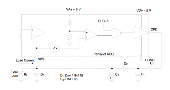 圖4給出了本應(yīng)用筆記中列出的A / D轉(zhuǎn)換器內(nèi)部的基本電荷泵調(diào)節(jié)環(huán)路的簡化版本。電荷泵驅(qū)動引腳(CPD)由XIN頻率產(chǎn)生的時鐘(CPCLK)驅(qū)動,可直接使用。CS5521 / 22/23/24/28器件使用XIN / 2 /時鐘。穩(wěn)壓器環(huán)路將電荷存儲電容器上產(chǎn)生的電壓幅度與VA +電源幅度的一部分進(jìn)行比較。該環(huán)路旨在將NBV的電壓調(diào)節(jié)為– [VA + / 2.38]V。請注意,如果芯片的VA +電源電壓高于+5 V,則NBV上的電荷泵輸出的電壓為成比例的更負(fù)面。當(dāng)NBV引腳上的電壓達(dá)到適當(dāng)?shù)姆葧r,電荷泵時鐘的周期將被刪除。調(diào)節(jié)環(huán)路將來自CPD引腳的脈沖頻率保持在產(chǎn)生適當(dāng)輸出電壓的平均頻率。CPD驅(qū)動器輸出由VD +電源提供,如圖4所示。可以為+5 V或+3V。圖4所示的二極管電荷泵用于+5 V電源。肖特基二極管D3確保NBV引腳的接地降落不超過二極管的壓降。這樣可以確保調(diào)節(jié)器環(huán)路正確啟動。 |