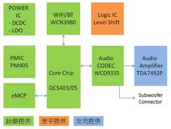 圖示2-基于Qualcomm產(chǎn)品的2.1CH音源擴(kuò)大機(jī)解決方案的方塊圖
