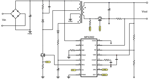 圖3:MPX2002典型應(yīng)用電路(原邊+ 副邊+ 反饋)